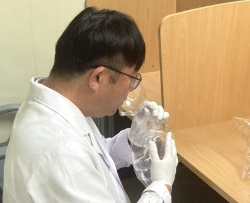 Nhân viên Viện Nghiên cứu Môi trường và Sức khỏe đeo mặt nạ thử nghiệm cảm quan để ngửi mùi khí trong túi khí