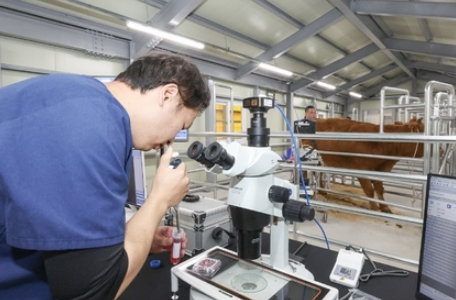 Nhà nghiên cứu đang thu hoạch trứng bò Hanwoo và thực hiện thụ tinh trong ống nghiệm tại Eco Farmland