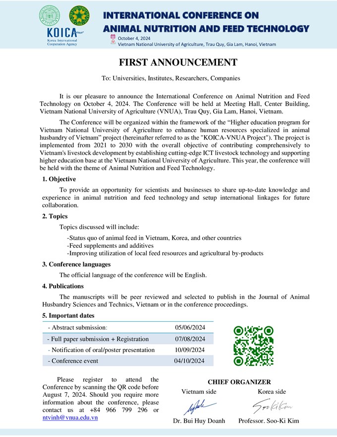 Hội thảo quốc tế Dự án KOICA_VNUA, Khoa chăn nuôi, Học viện Nghiệp Việt Nam thông báo về việc tổ chức Hội thảo quốc tế “Animal Nutrition and Feed Technology” diễn ra vào 04/10/2024 Ngày đăng: 24/09/202424/11/2025 by Admin